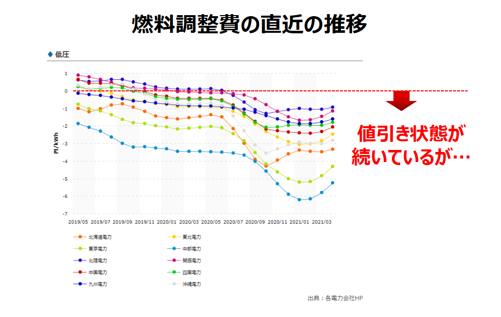 電気代の内訳として最終的に、「燃料調整費」というものがあります。 これは、みなさんが身近でわかりやすい言葉に言い換えると「燃油サーチャージ」にような料金です。以前までは燃料調整費が毎月のように値上がりし続けていることが要因で、値引きされていた時点と比べると1割~3割増となっておりその負担金額は決して無視出来ないものとなってきていましたが、平均燃料価格が基準燃料価格より低い現在はマイナス調整が続いています。 以下は2024年の7月分から8月分にかけての燃料調整費の単価比較となります。![]()
