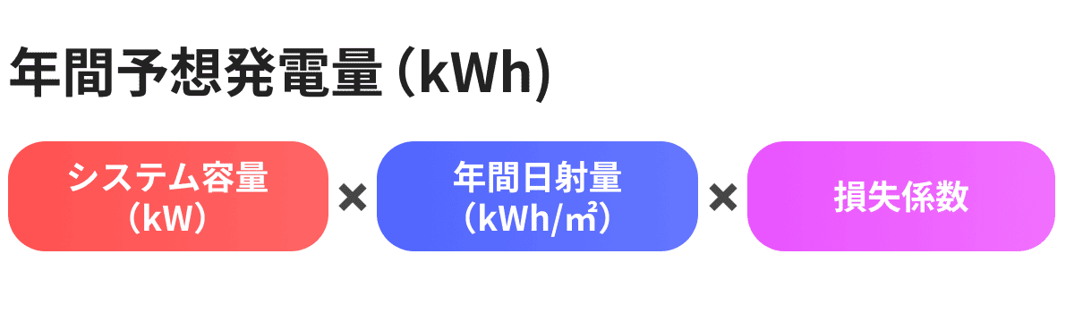 - 発電量は「システム容量 × 日射量 × 損失係数」で計算できる