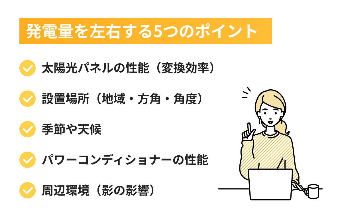 同じシステム容量でも、設置条件によって発電量が大きく変わることがあります。ここでは、発電量を左右する特に重要な5つの要素を解説します。
