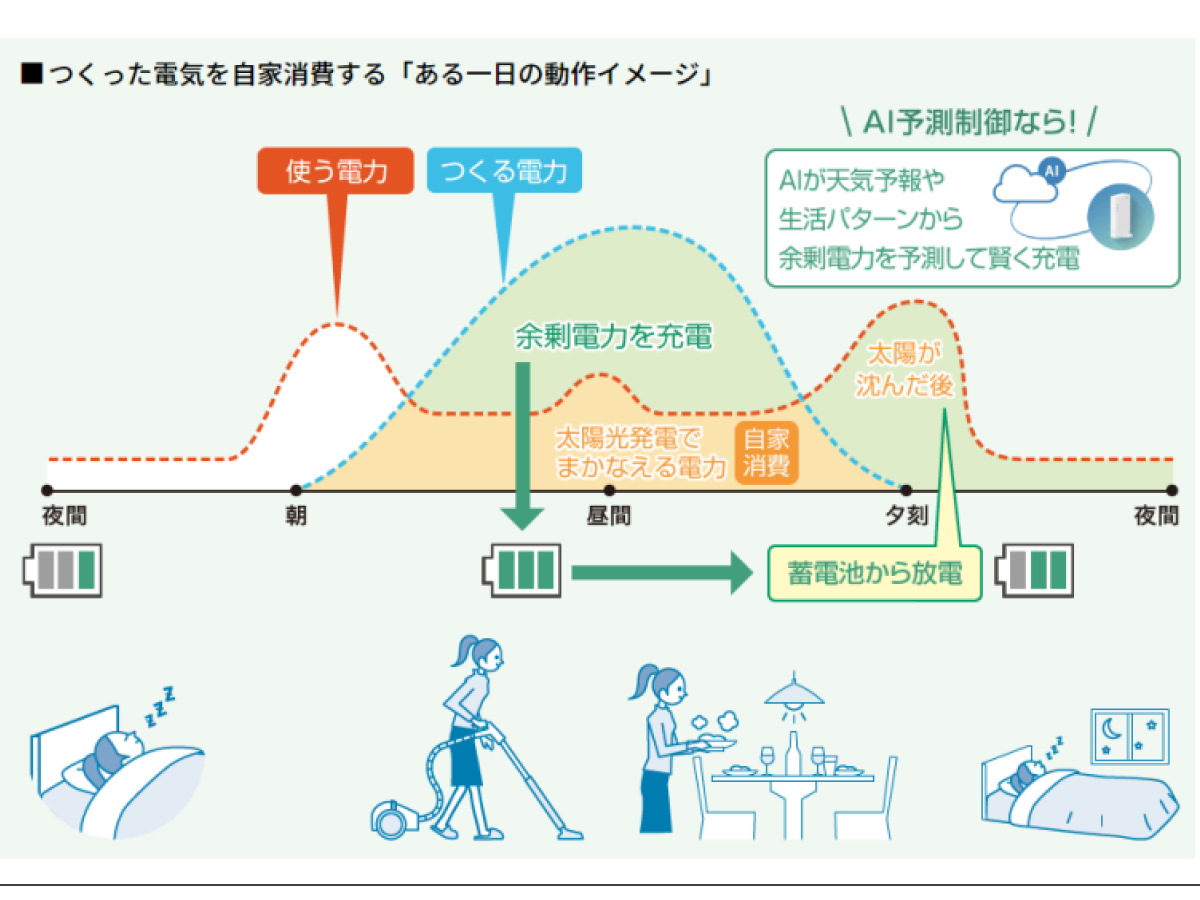 「発電した電気は、売るよりも自分で消費したほうがお得」です。日中に発電した電気を蓄電池に貯めて夜間に使うことが太陽光発電の設置費用を回収するためのポイントです。