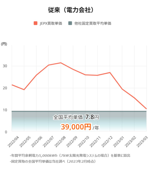 2023年の3月はギリギリでJEPXでの買取単価が固定単価を上回る数字となりましたが、JEPXの買取単価とそれぞれの会社が独自に設定した固定単価の差が電力会社側の利益となる部分で、月によっては20円以上も差があります。