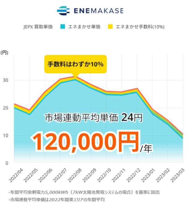 エネまかせは2022年11月25日より開始した、卒FITに該当する太陽光発電システムにて発電した電力のうち余剰電力に当たる部分をJEPX(日本卸電力取引所)の取引単価に連動して買い取るサービスです。