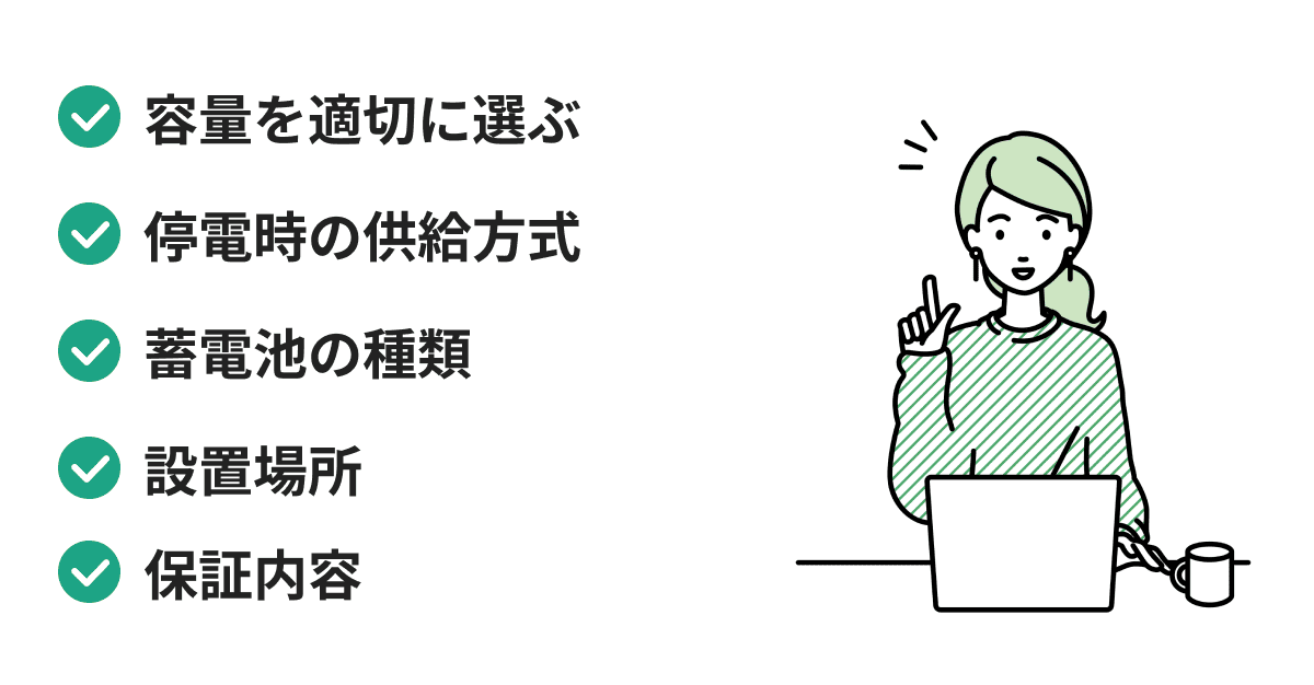 蓄電池を選ぶときに重要なのは、容量、停電時の供給方式、種類、設置場所、保証内容の5つです。導入の目的(電気代削減か、災害対策かなど)によって最適な製品は変わります。