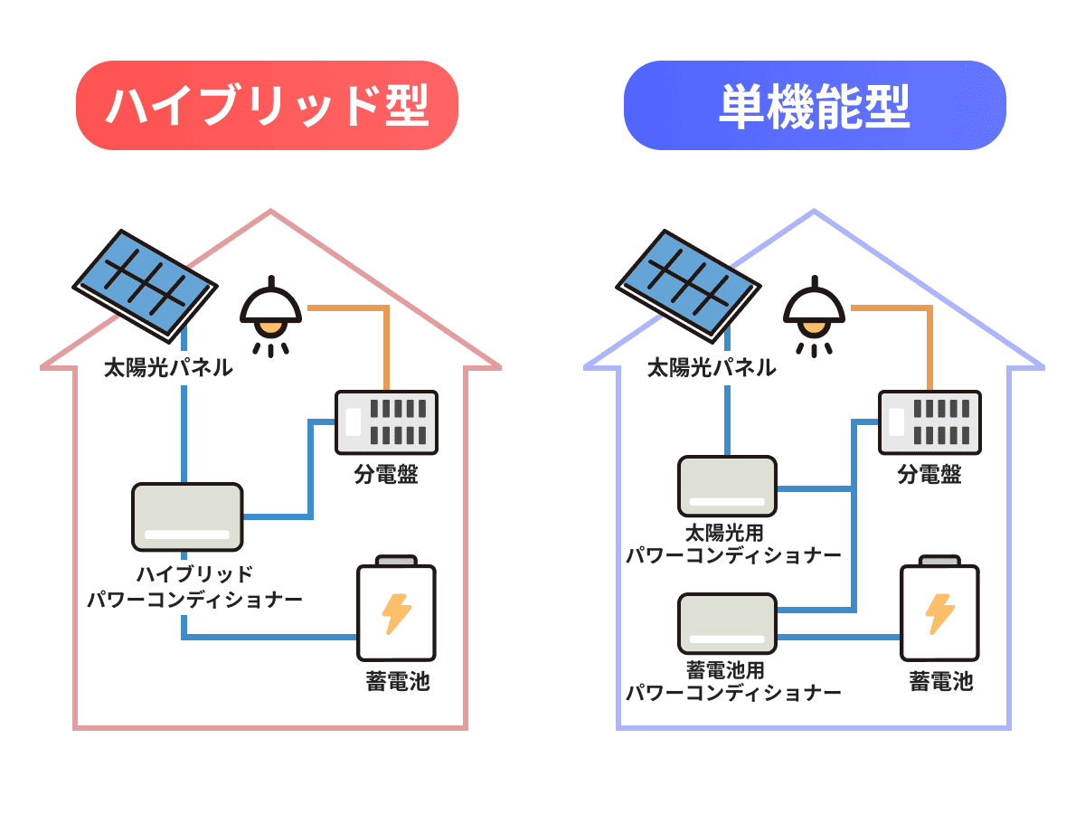 - 単機能型: 電力会社からの電気のみを充放電するシンプルなタイプです。太陽光発電システムが既にあり、買い足したい場合に適しています。