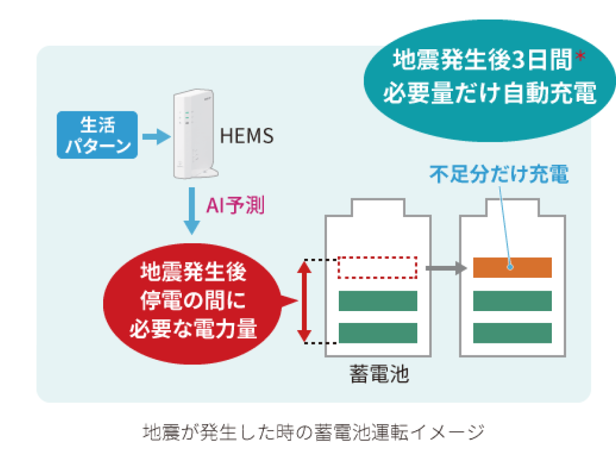 地震発生後、停電しなかった場合でも、AIが自動で蓄電池を満充電に。その後の余震による停電に備えることができます。災害時の不安を少しでも和らげてくれる、シャープならではの心強い機能です。
