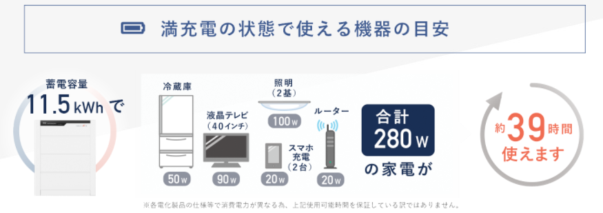 11.5kWhと言えば、平均的な1日で使う電力の1日分~半日以上をまかなうことができます。