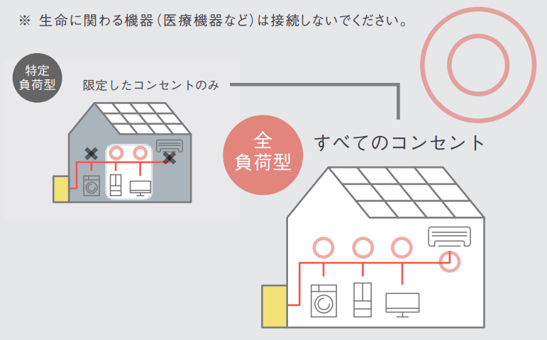 全負荷型とは、停電した際に家じゅうの家電機器がいつも通り使うことができる、バックアップのことを言います。