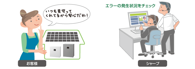 「蓄電池Webモニタリングサービス」で、インターネットを通じて、クラウド蓄 電池システムにてエラーが発生していないかシャープがしっかり見守ります。万一、不具合が発生した場合も、すぐに発見・対応するので安心です。