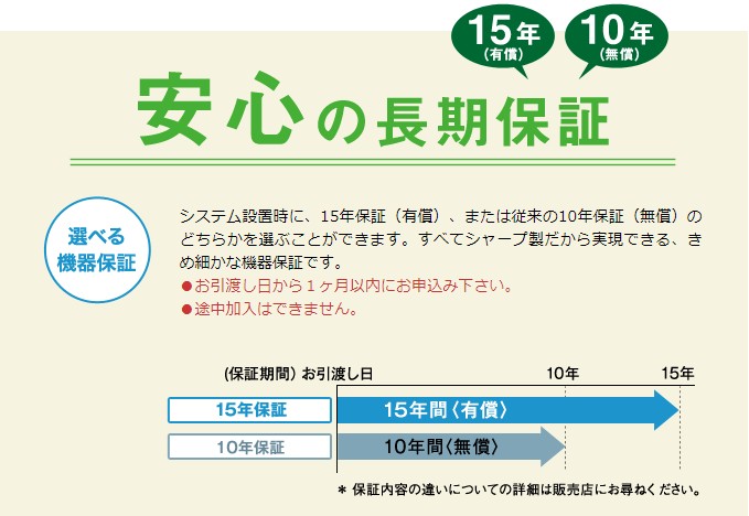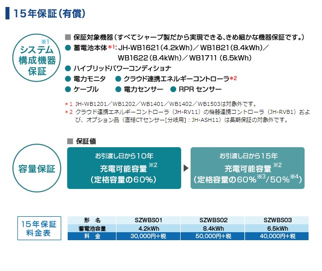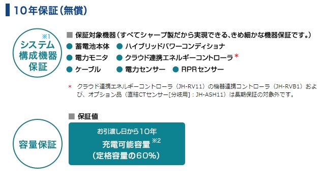SHARP(シャープ株式会社)では住宅用エネルギーソリューションシステムとしてクラウド蓄電池システムを扱っています。長期保証として蓄電池システム15年保証(有償)または10年保証(無償)と補償制度も充実しております。