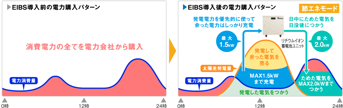 普段から経済的な生活をしたいなら、「ノーマルモード」運転におまかせ。 料金の安い深夜の電力を貯めておき、「太陽光発電による売電」と「蓄電池からの放電」とで割高な電気を買わないよう賢く運転します。 電気代の無駄を許さない賢いエネルギーマネジメントシステム、それが蓄電ハイブリッドシステム「EIBS(アイビス)」です。