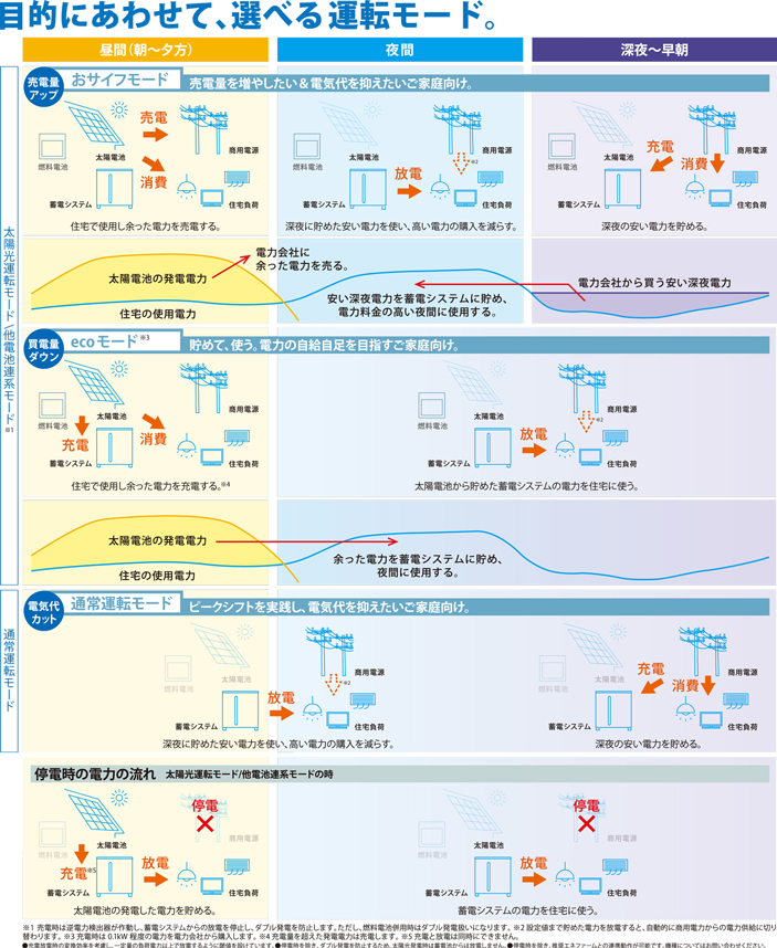 エリーパワーの家庭用蓄電システムは、ご家庭の生活パターンやニーズに合わせて選べる運転モードをご用意しています。