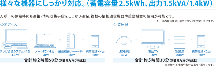 - 蓄電容量は従来機※と同じ(2.5kWh)。さらに高出力化(1.5kVA)。