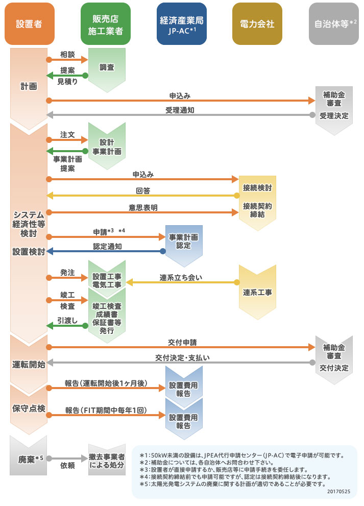 太陽光発電協会が自己所有の場合の太陽光発電システムの導入計画から運転を開始するまでの大まかな流れや作業について、わかりやすく画像にまとめてくれています。